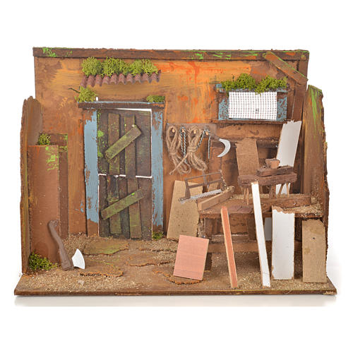 Tischler Stand 33x18x25cm. Krippensszene realsiert aus Holz, Kork und Harz.