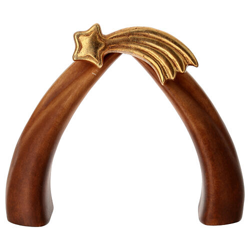 Stilisierter Krippenstall mit farbiger Sternschnuppe – bemaltes Ahornholz, Grödnertal