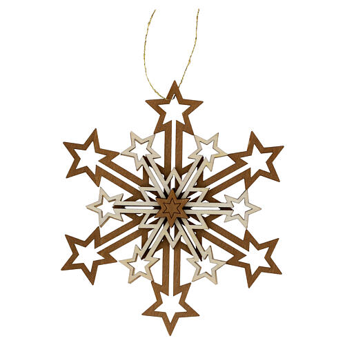 Dekorativer Holzanhänger in Form einer Schneeflocke mit sternförmigen Enden – handgefertigt in Italien nach der traditionellen Holzschnitzkunst des Grödnertals.
