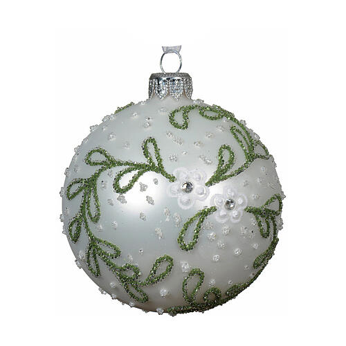 Christbaumkugel, 80 mm, weiß matt, Glas, handbemalt mit Zweigen und Blüten