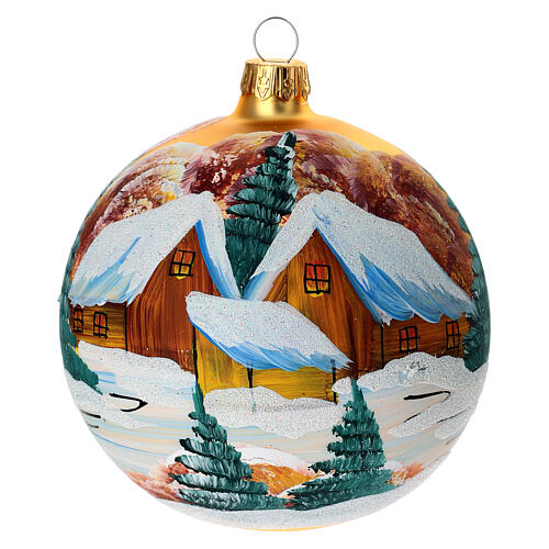 Die Kugel, die eine schneebedeckte Landschaft mit goldenem Hintergrund darstellt, wird von polnischen Künstlern aus mundgeblasenem Glas hergestellt und mit handgezeichneten Motiven versehen. Die Kugel eignet sich hervorragend zum Schmücken des Weihnachtsbaums und ist ein einzigartiges Stück.
