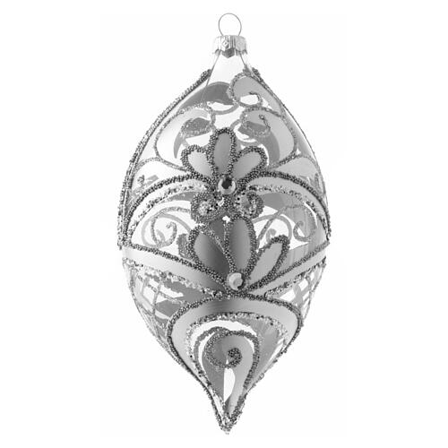Weihnachtsbaumkugel aus transparentem Glas in Tropfenform mit silbernen Verzierungen 100 mm hoch
