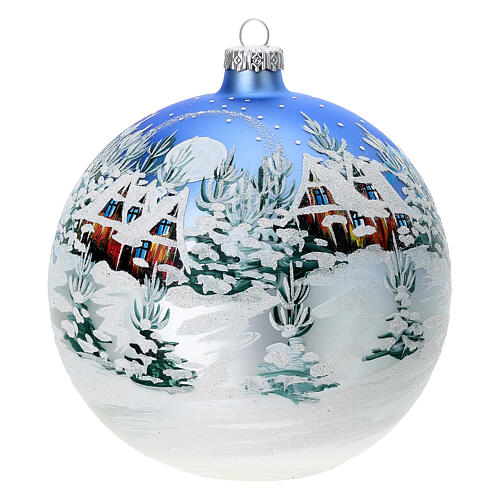 Weihnachtsbaumkugel, mundgeblasenes Glas, mit Winterlandschaft in Hellblau und Weiß – Ø 150 mm