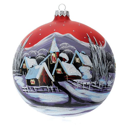 Weihnachtskugel aus Glas, Grundton: Kupferfarben, bemalt mit dem Motiv eines schneebedeckten Dorfes bei Sonnenuntergang, Durchmesser der Kugel: 150 mm.