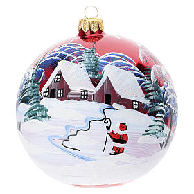 Weihnachtskugel, mundgeblasen, rot matt mit verschneiter Landschaft und Zaun, Ø 100 mm