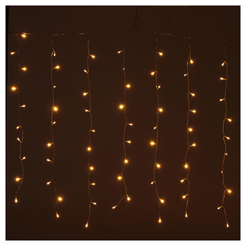 Dieser Lichtervorhang verfügt über 240 warmweiße LEDs. Er ist 4 m lang und besteht aus 24 Strängen mit je 1 m Höhe.