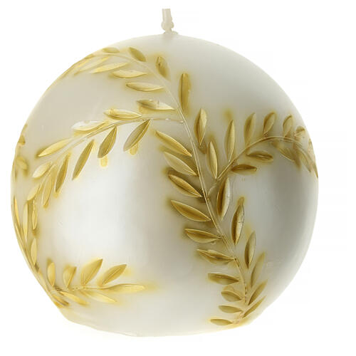 Diese weihnachtliche Kugelkerze wird in Italien kunsthandwerklich gefertigt. Sie zeigt eine glänzende Farbgebung in Perlmuttoptik und ist mit eingeschnittenem Dekor aus goldfarbenen Zweigen und Blättern versehen.