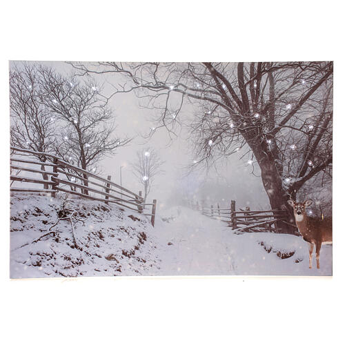 Leuchtendes Weihnachtsbild aus Glasfaser mit den Maßen 40x60x1,5 cm, das eine verschneite Landschaft in Schwarzweiß und ein farbiges Rentier, das rechts erscheint, darstellt.Um zu funktionieren, benötigt der Artikel 2 AA-Batterien, die nicht im Lieferumfang enthalten sind.
