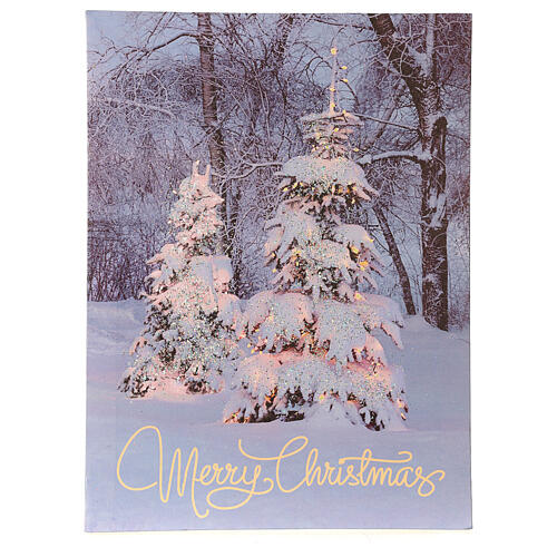 Leuchtendes Glasfaser-Weihnachtsbild mit zwei verschneiten und beleuchteten Bäumen und mit dem Satz Frohe Weihnachten in goldenen Buchstaben.Das Bild ist mit Glitzer verziert und das Bild ist 40x30x1,5 cm groß.Um zu funktionieren, benötigt das Produkt zwei AA-Batterien, die nicht im Lieferumfang enthalten sind.